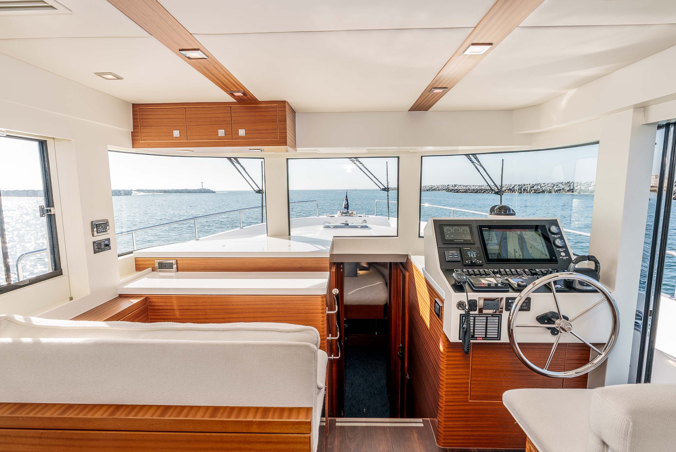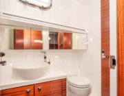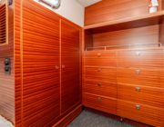 - Island queen berth with 9″ foam mattress with laminated teak trim