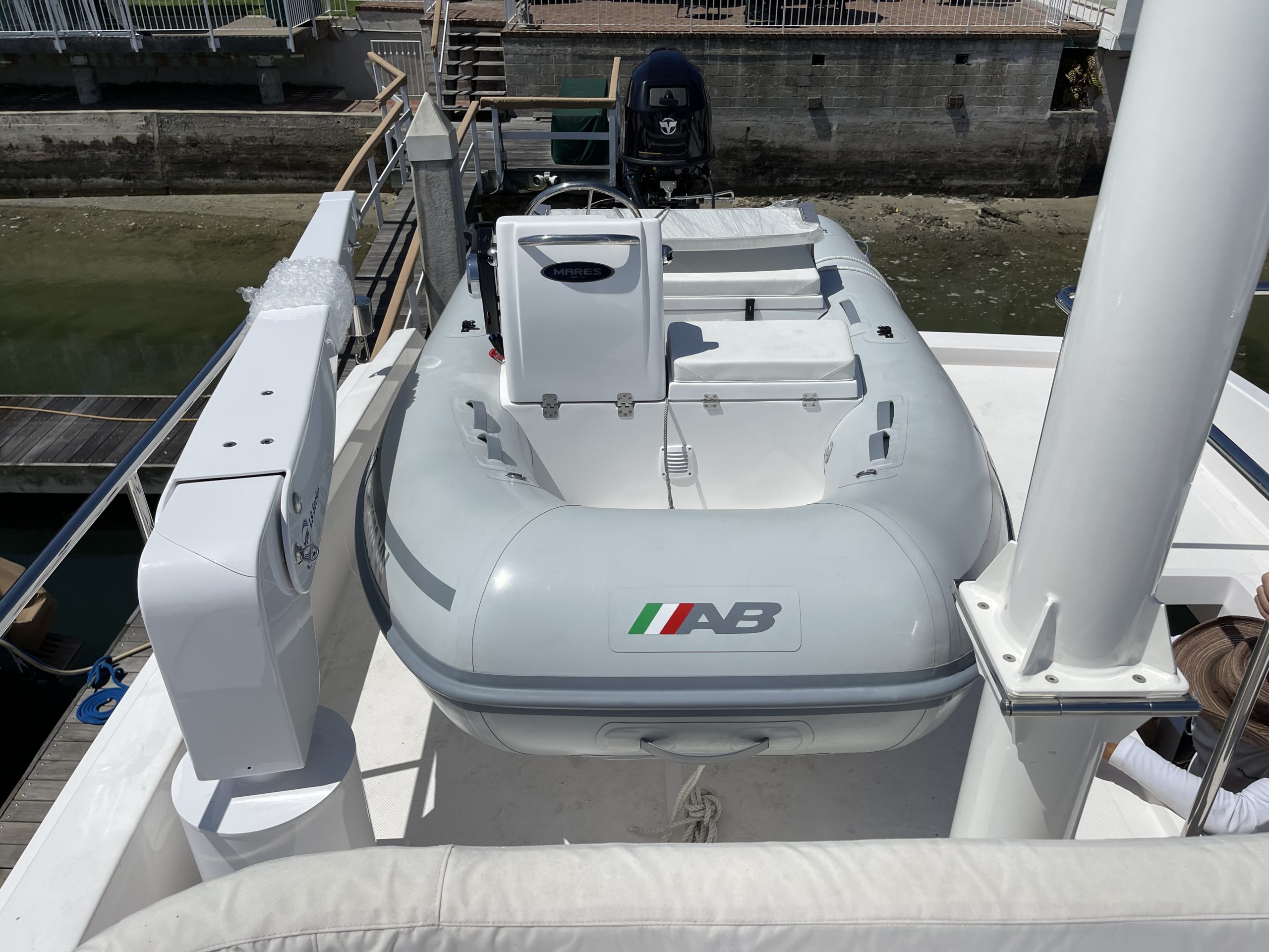 - Aluminum mast (white powder coat) on flybridge. Hinged to lower bridge clearance